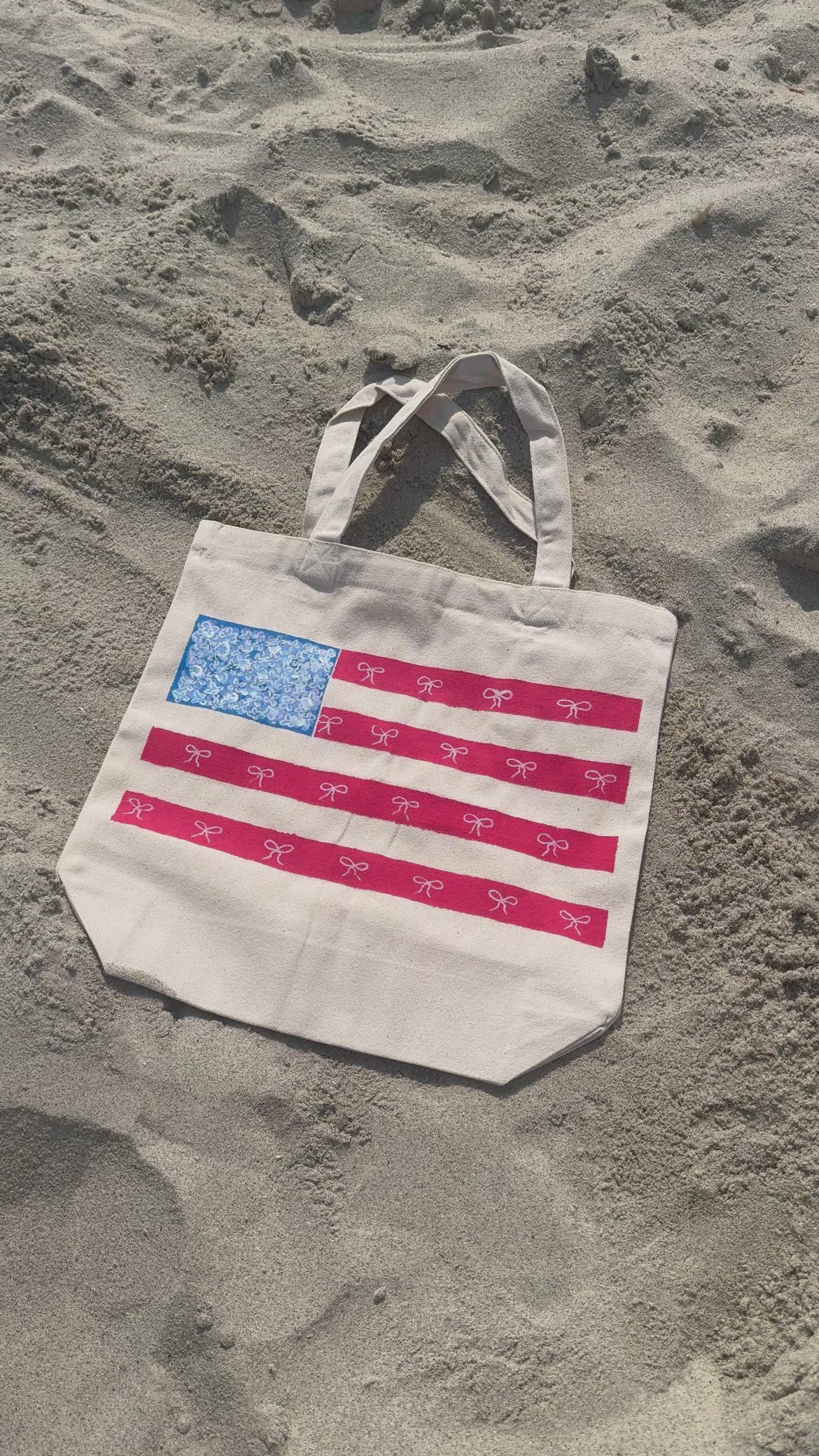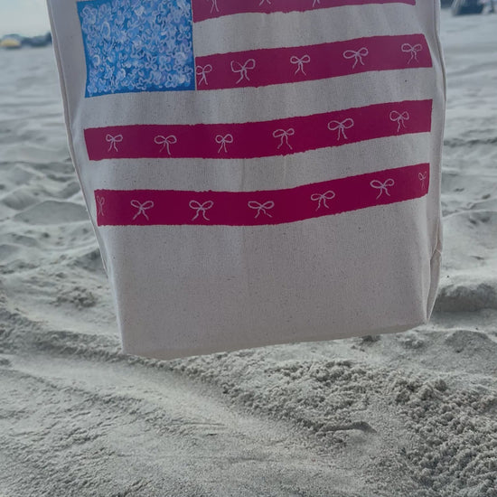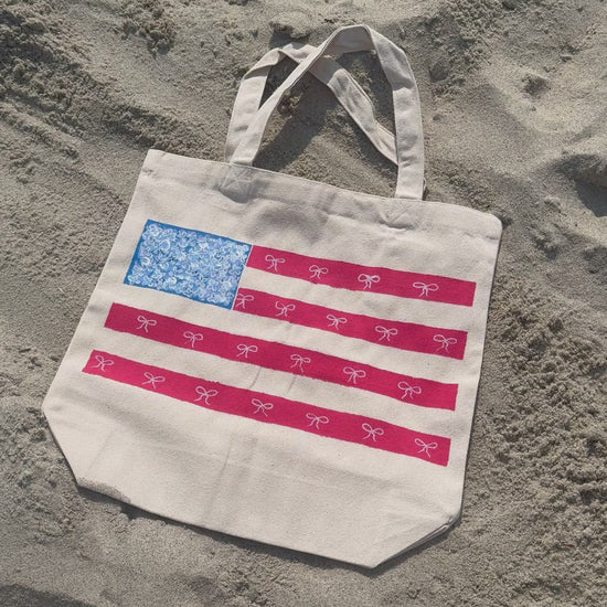 A fresh twist on the classic American flag - painted by hand with delicate details. Red stripes feature dainty white bows, and the blue field blooms with hydrangeas for a coastal, summer-ready vibe. Perfect for the beach, farmer's markets, or patriotic holidays.